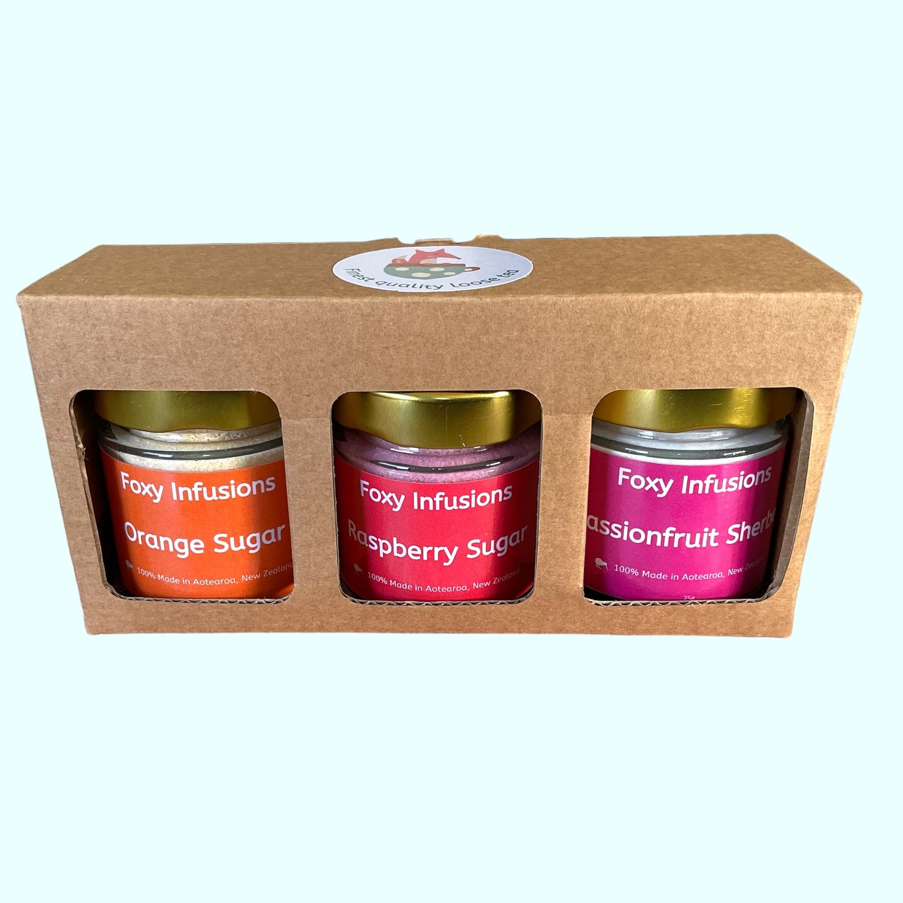 Trio of flavours include: Passionfruit sherbert, Raspberry sugar, Orange sugar.