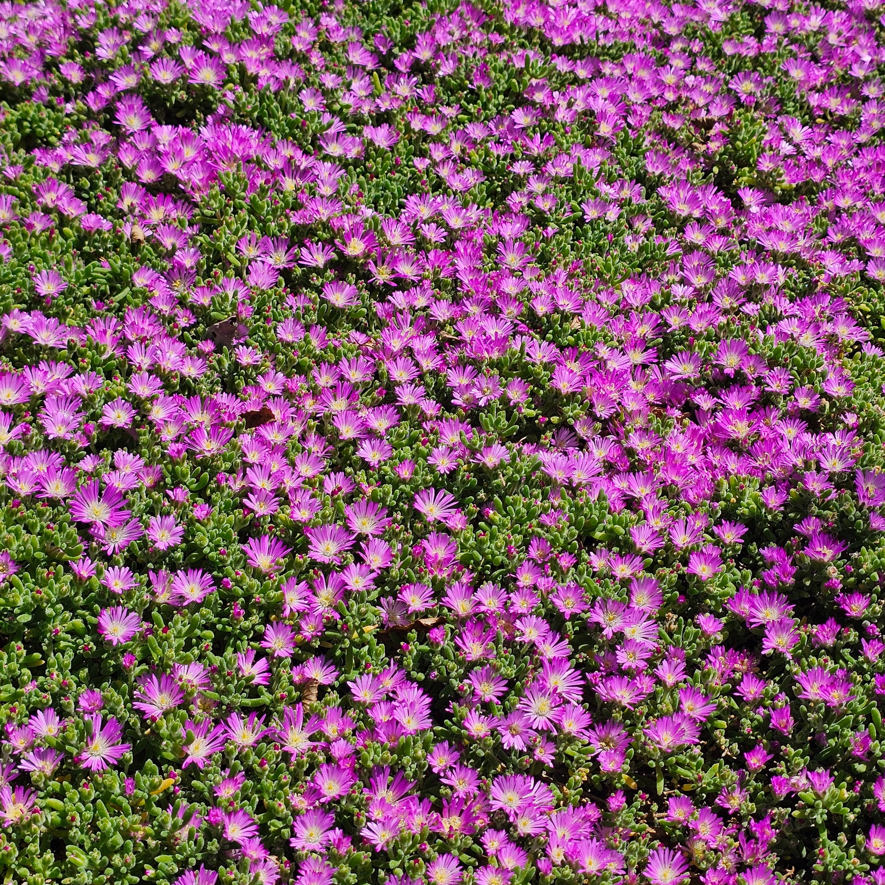 The trailing ice plant produces a profusion of small, daisy-like flowers that bloom in shades of pink, purple, or magenta. These flowers typically appear in the spring and summer months, adding a splash of color to the landscape. Mesembryanthemum is relatively easy to care for, thriving in well-draining soil and full sun.