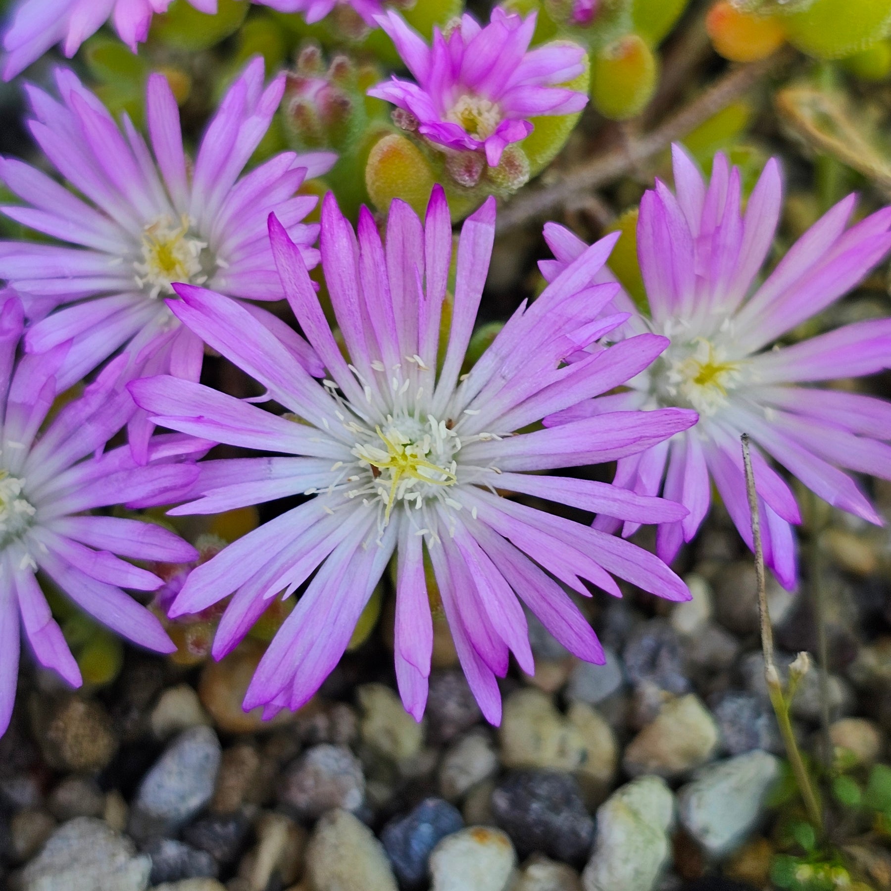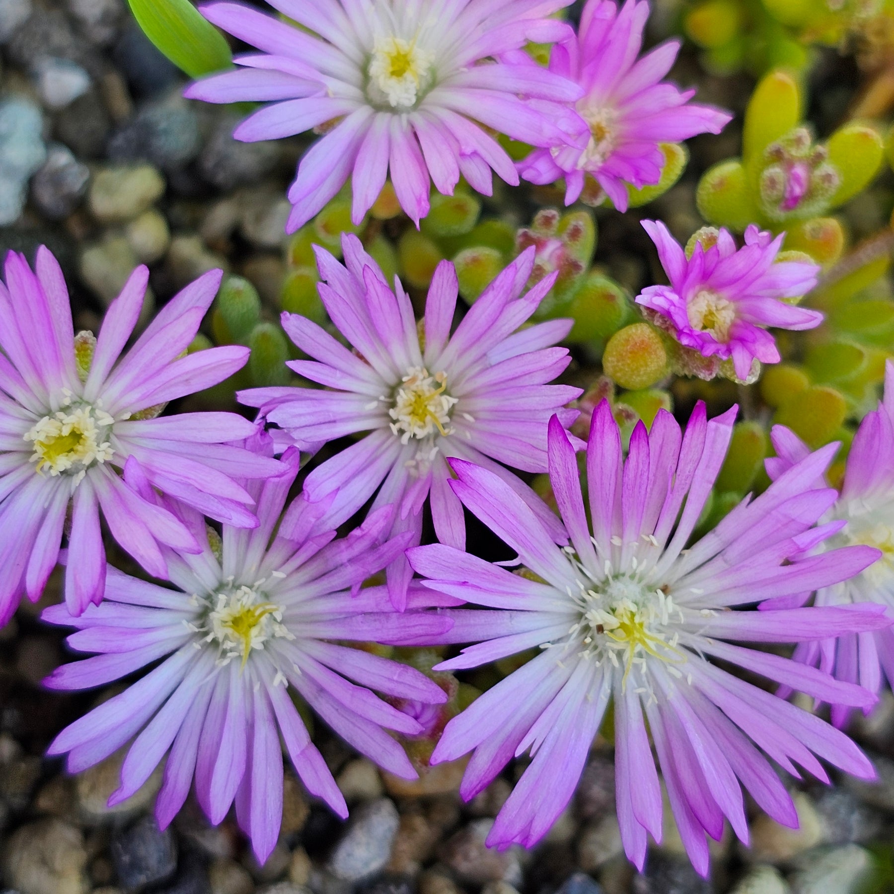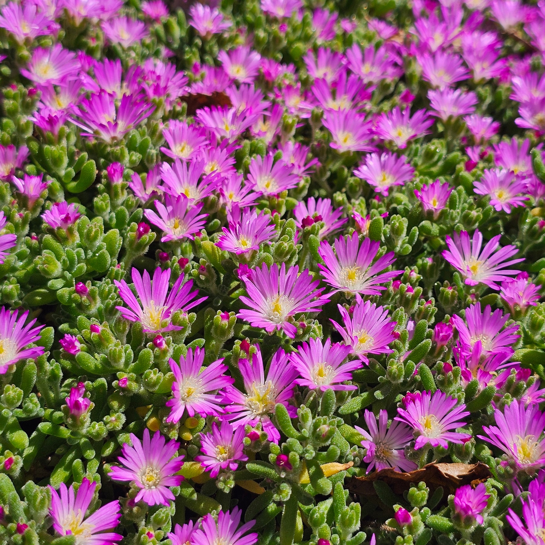 Mesembryanthemum, commonly known as the trailing ice plant, is a succulent plant native to South Africa. It's a low-growing, mat-forming plant that is often used as ground cover. The plant has small, fleshy, green leaves that are covered in tiny, glistening hairs, giving it an icy appearance, hence the name.