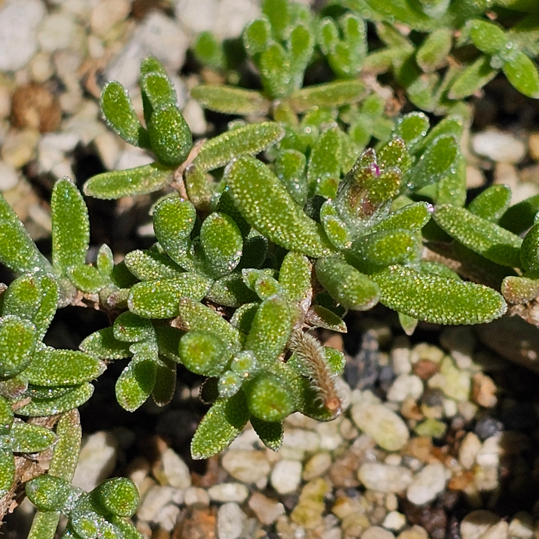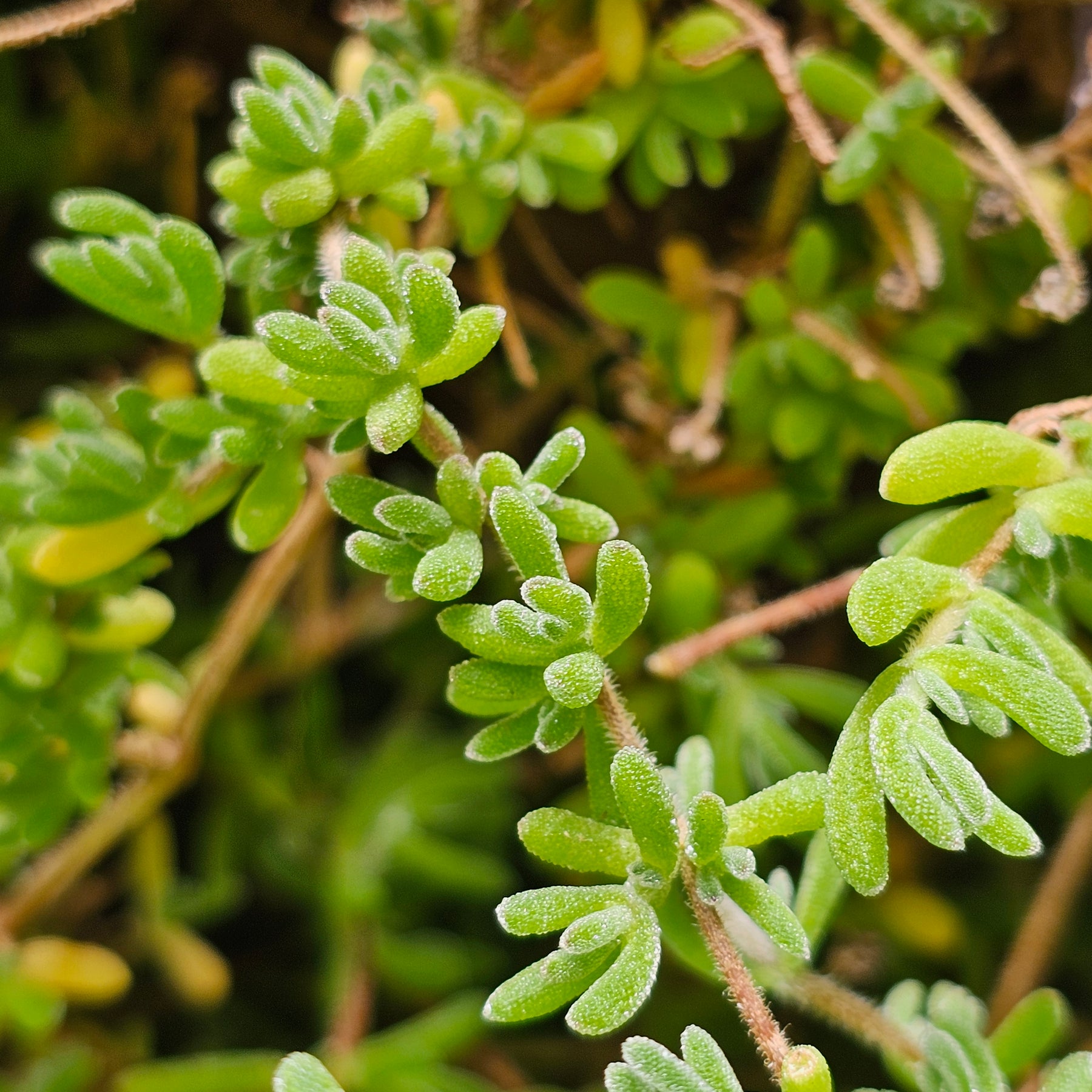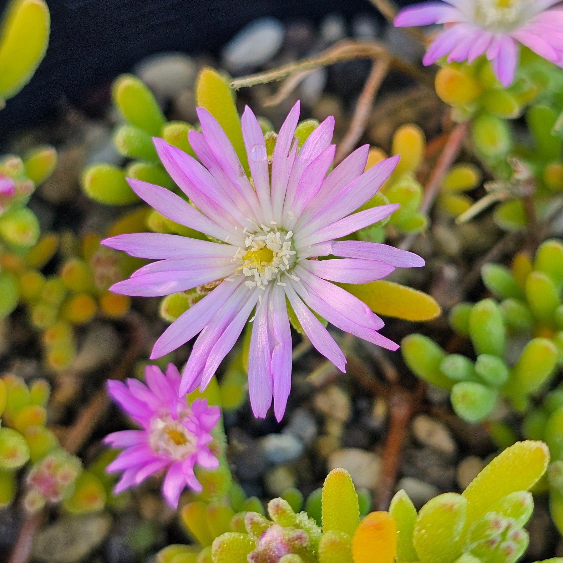 Mesembryanthemum, commonly known as the trailing ice plant, is a succulent plant native to South Africa. It's a low-growing, mat-forming plant that is often used as ground cover. The plant has small, fleshy, green leaves that are covered in tiny, glistening hairs, giving it an icy appearance, hence the name.