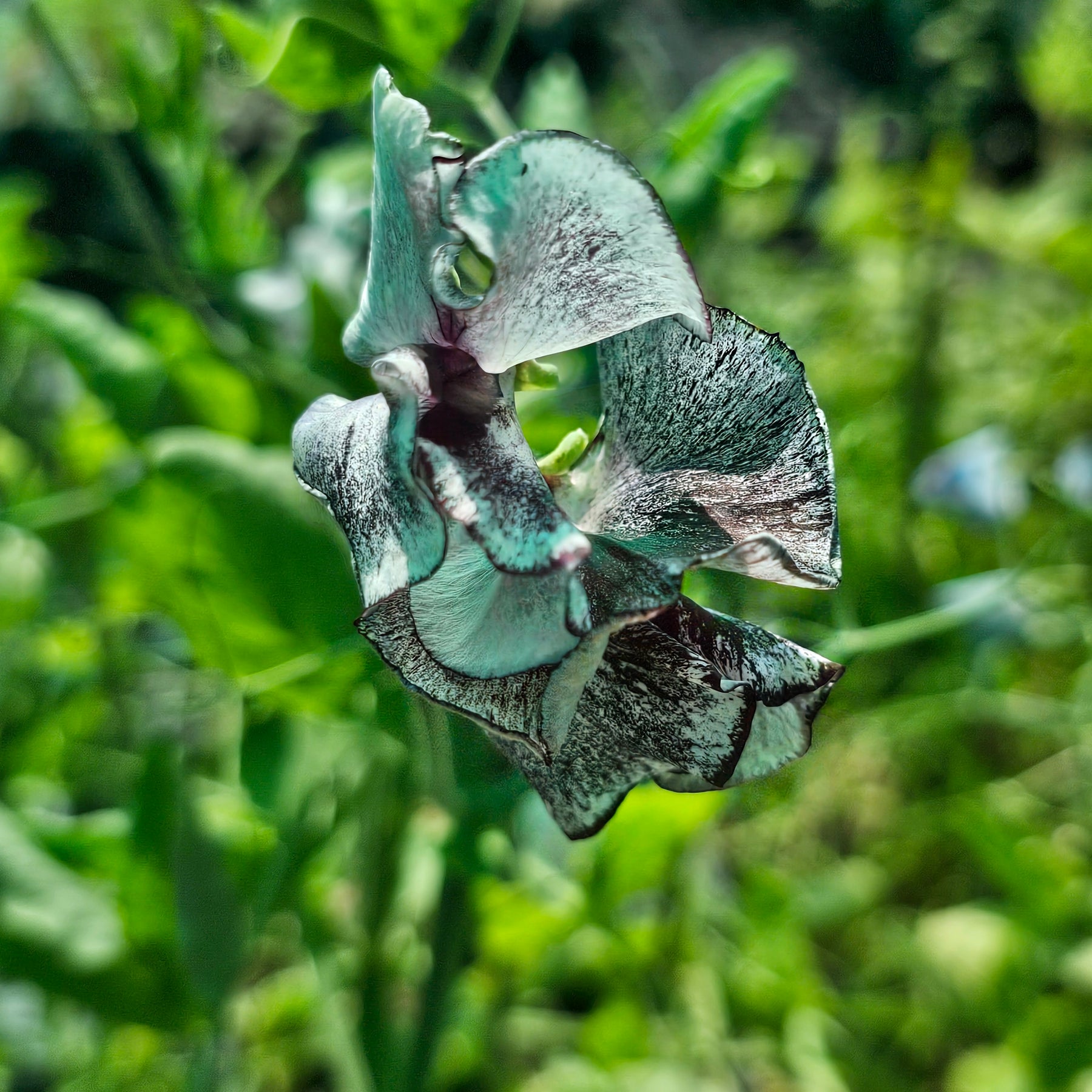 ‘Nimbus’ sweet pea is a fragrant annual climber known for its elegant, delicate blooms. Reaching heights of 1.8 to 2.4 meters, it is well-suited for trellises, fences, and other structures. This English-bred variety is a striking example of a striped sweet pea, with distinctive markings appearing solely on the back of the standard petal and the upper sections of the wings. Its flowers display a gentle lavender hue adorned with rich purple accents speckled on the petals, creating a unique and consistently impressive floral presentation.