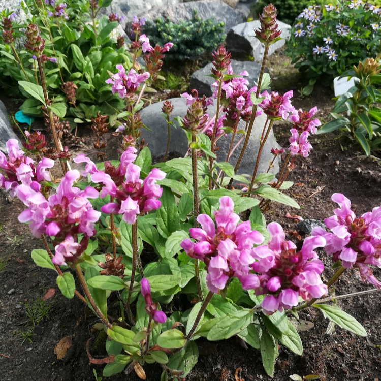 Also known as large flowered Self-Heal, this lovely herbaceous ground cover is a tough plant that will thrive in full sun or part shade. Grows to 25cm tall and 50 cm wide, it loves a moist spot until established. The blooms stand upright on strong, but short stems. They're very showy, deep pink clusters from summer into autumn. Great value and really hardy.