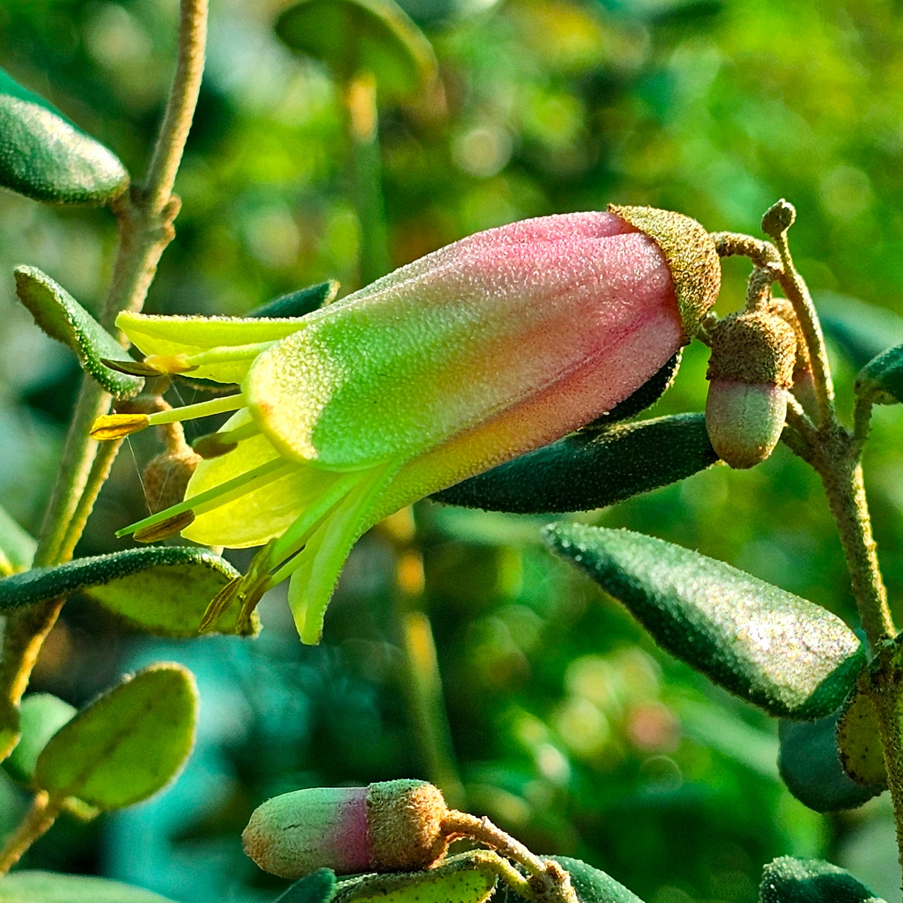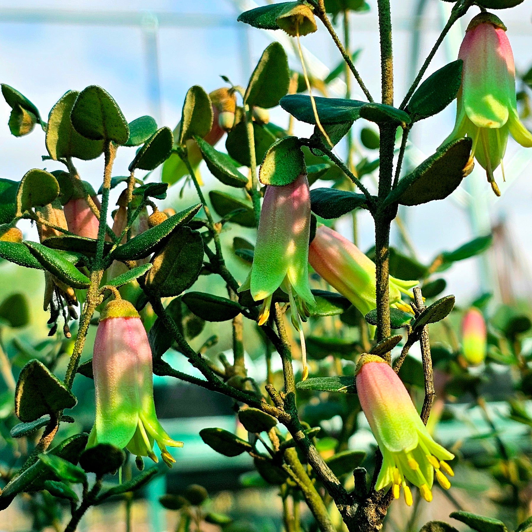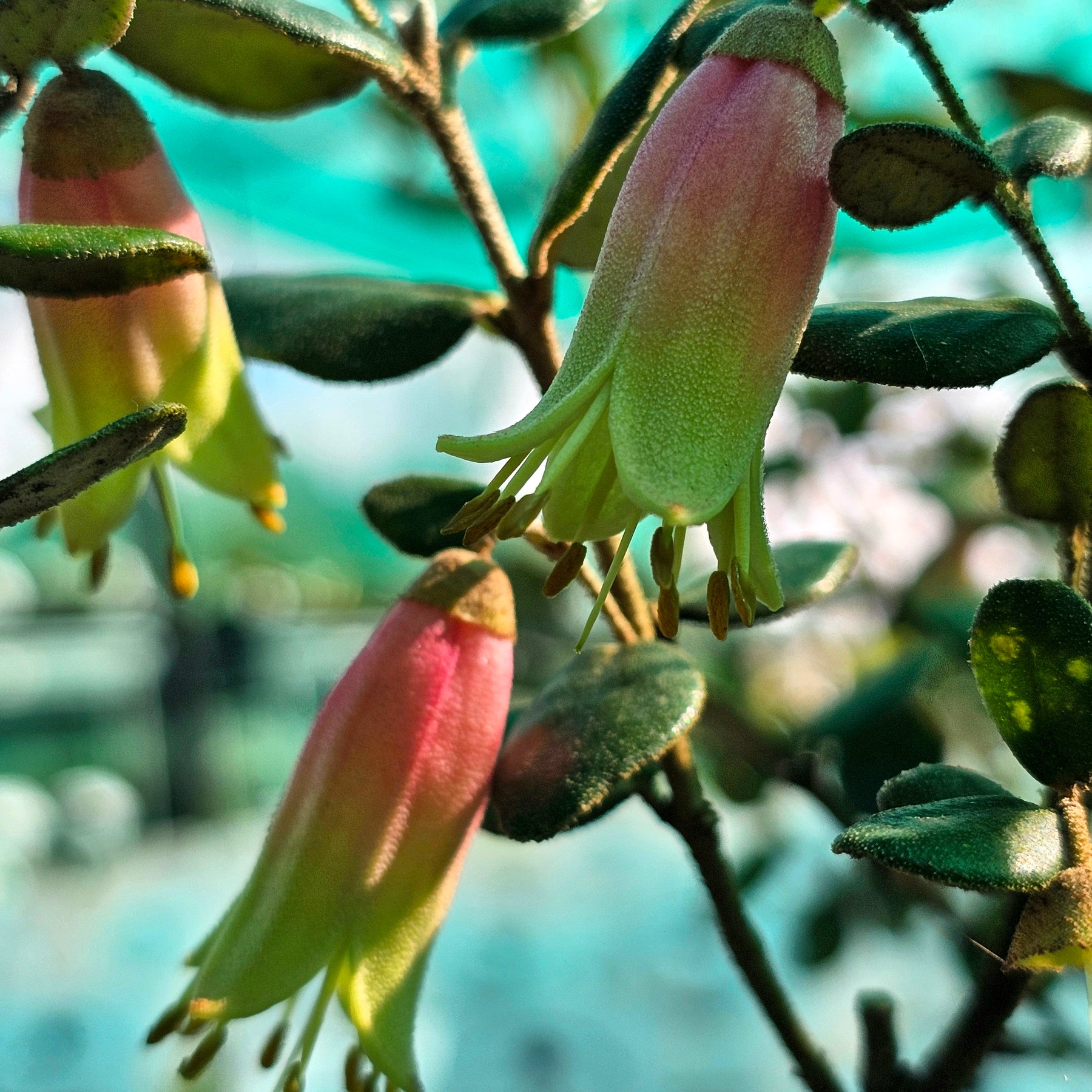 Correa Marions Marvel, a lovely little Australian native plant that blooms almost all year round. It is evergreen with gorgeous little green and pinky peach bells, borne on reddish brown stems. Their leaves are firm and strong. Loves a sheltered spot against a wall. it thrives best in full sun or part shade and needs good moisture but free draining soil...it will tolerate drought though.