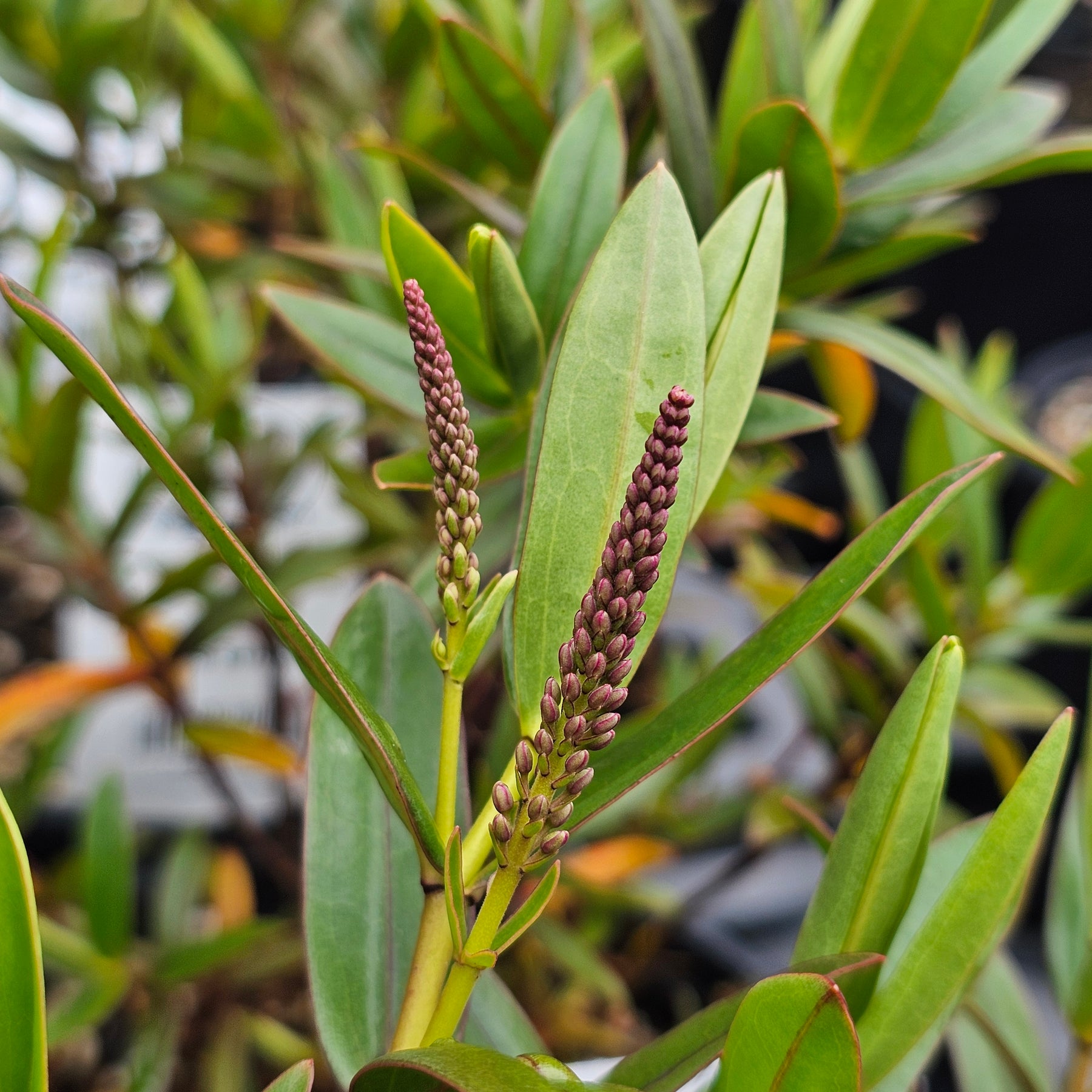 Hebe 'Icing Sugar' is known for its distinctive, slender, and pointed leaves, which emerge a vibrant lime green, maturing to a rich, glossy dark green.