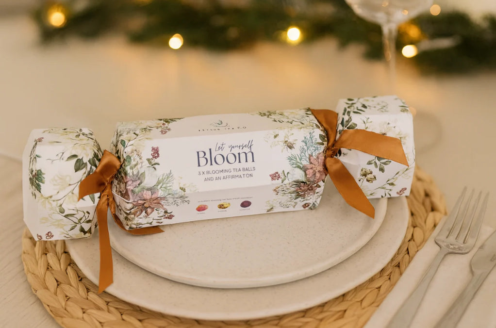 Cracker contains: 3 x Blooming tea balls and an affirmation card (non-Christmas themed)
